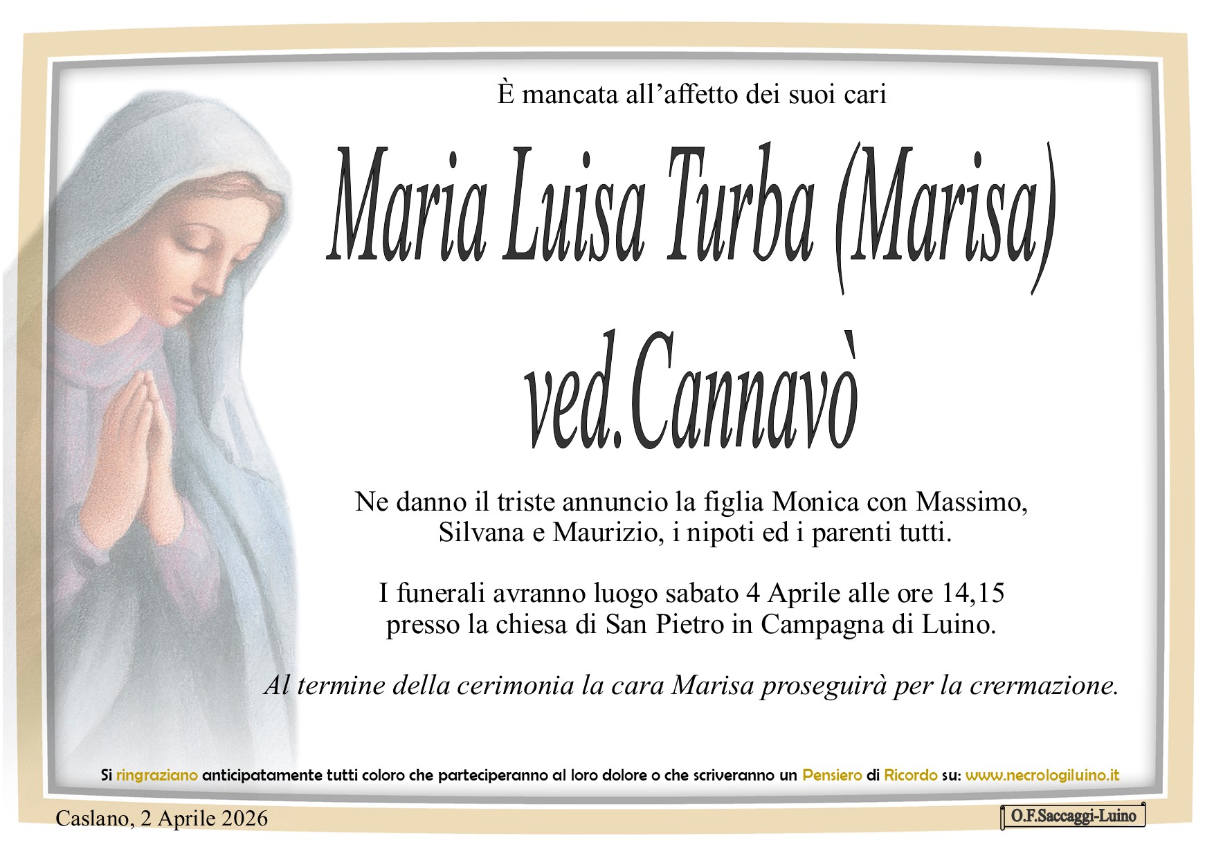 I familiari ringraziano anticipatamente tutti coloro che parteciperanno alla cerimonia funebre e tutti coloro che scriveranno con affetto un Pensiero di Ricordo.