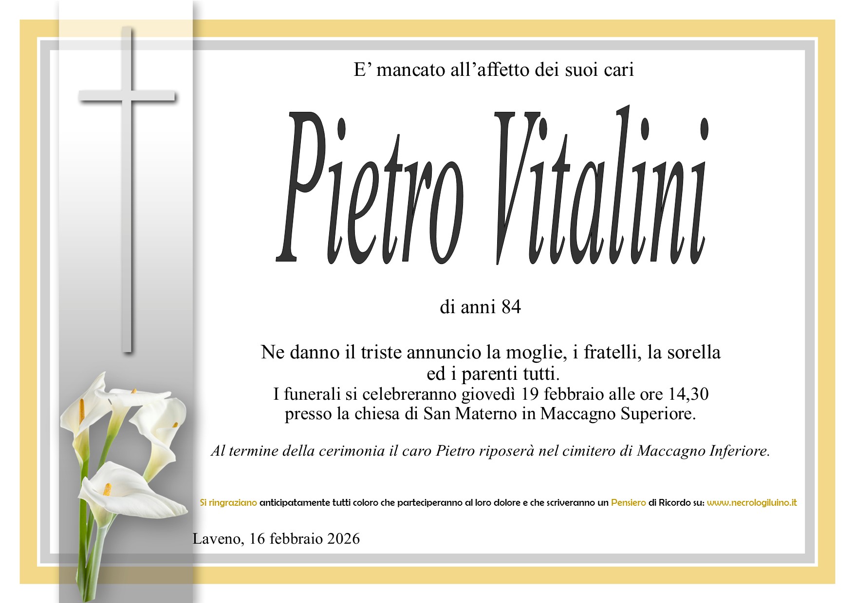 I familiari ringraziano anticipatamente tutti coloro che parteciperanno alla cerimonia funebre e tutti coloro che scriveranno con affetto un Pensiero di Ricordo.