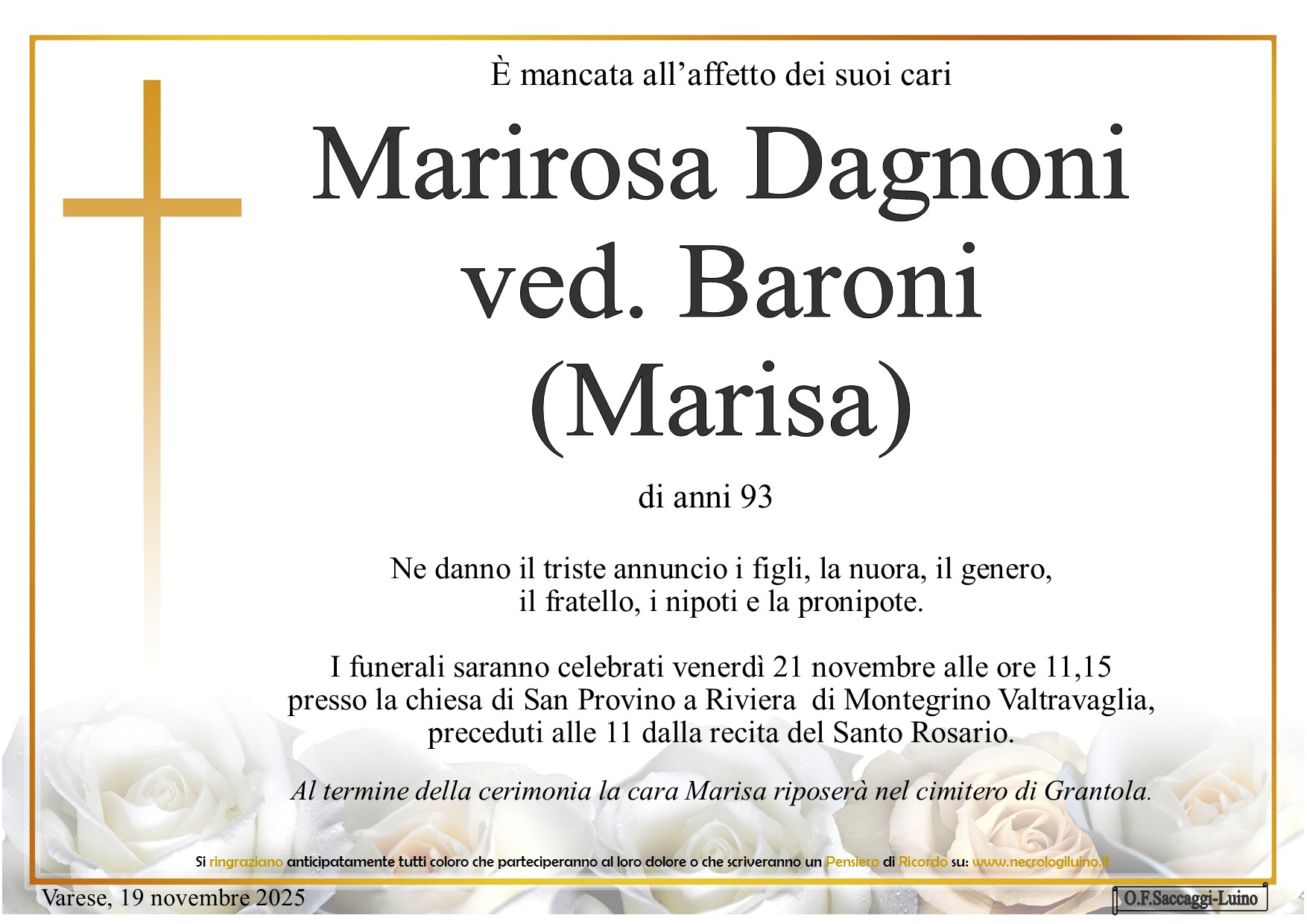 I familiari ringraziano anticipatamente tutti coloro che parteciperanno alla cerimonia funebre e tutti coloro che scriveranno con affetto un Pensiero di Ricordo.